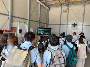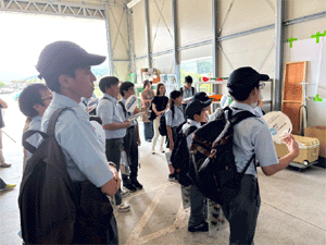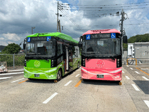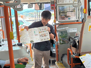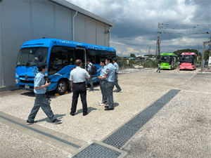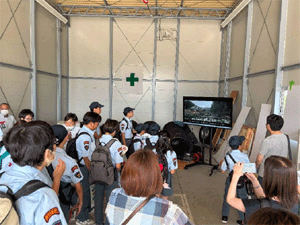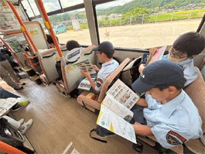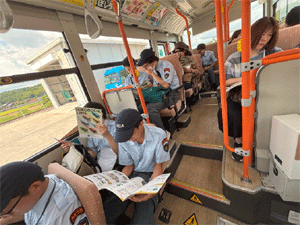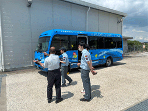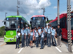 実証実験中の水素燃料電池バスに乗り込み視察をする団員達