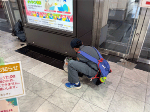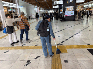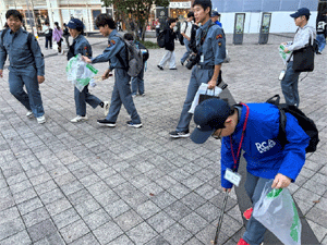 清掃活動に必要な道具やゴミ袋を受ける団員達