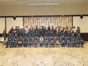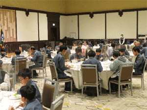 | テーブルマナー講習会に先立ち4団合同で記念写真 | テーブルマナー講習会に先立ち団歌斉唱する団員達 |