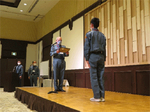 | 各団長から全国鉄道少年団作文コンクールの 表彰を受ける団員 |