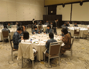 | オードブルから始まりスープ、魚料理、肉料理と スプーン・ナイフ・フォークの使い方に悪戦苦闘しながらも 積極的にチャレンジする団員達 |