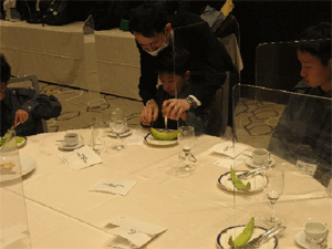 | ホテルマンからデザート(メロン)へのナイフの入れ方など 手ほどきを受けながらも果敢にチャレンジする団員 |