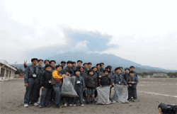 桜島の噴煙をものともせずグランドの石ころを拾う