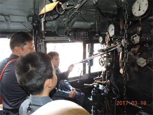 「SL59647」の運転台で機関士体験をする