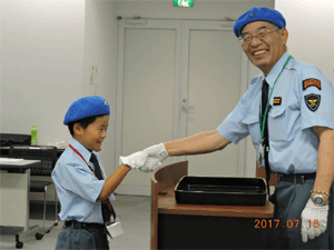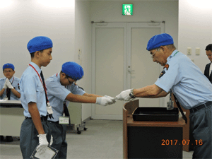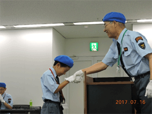団長から鉄道少年団のベレー帽を戴帽される新入団員