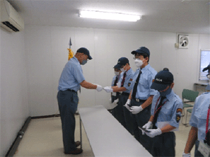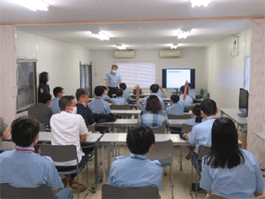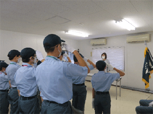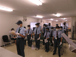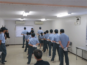 | 新入団員とともに行動訓練に励む団員達 | JR九州運輸部乗務員課の社員の方から、 乗務員になるための方法について学ぶ |
