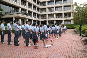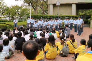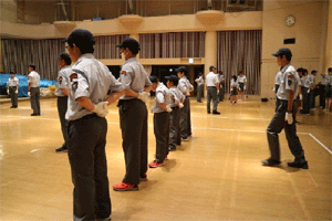 | 夕べの集いで鉄道少年団のPRを行う団員 | キャンプ1日目の夜、団体行動訓練に励む |