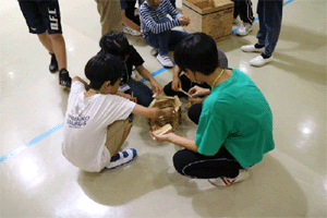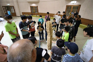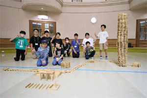 | 班員で構想した図案どおりにカブラを積み上げていく | 駅と線路、そしてそれに繋がる高層ビルを表現した カブラ積木に達成感を漂わせる団員達 |