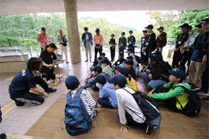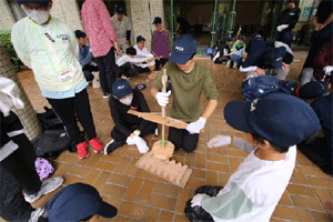 「火起こし体験」活動で施設係員の方の 実演に見入る団員達 |