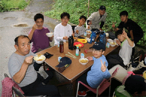 | 「火起こし体験」に果敢にチャレンジする団員 | 野外炊飯の成果を味わう団員達 |