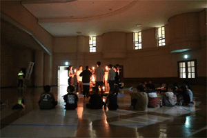| 入所時のオリエンテーションで団歌にチャレンジする団員 | 入所初日の夕べの集い臨む |