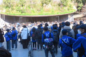 マナーを守って整然と参拝の時を待つ団員達
