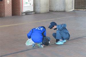| JRスペースワールド駅構内でクリーンアップ活動を行う団員 | JRスペースワールド駅構内で排水溝に捨てられた タバコの吸い殻を一心不乱に拾う団員 |