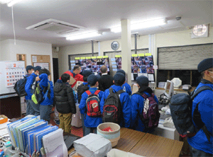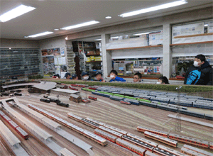 | NPO法人「汽車倶楽部」で旧直方駅のジオラマで 筑豊地区における鉄道の果たした役割や歴史について 学ぶ団員達 |