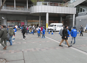 | 博多駅前でJR社員や西日本鉄道の社員とともに 踏切事故防止のチラシを配布し、踏切の安全通行を 呼びかける団員達 |