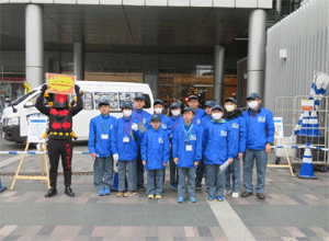 | 踏切事故防止の啓蒙活動終了後JR九州社員が扮する 踏切マンと記念撮影 |
