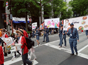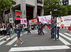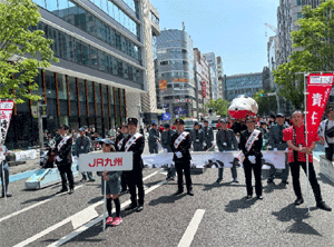 | JR九州博多シティパレード隊のプラカードとメインの 横断幕を持って、元気に沿道のお客様へ JR九州博多シティをPRする九州4団の団員達 |
