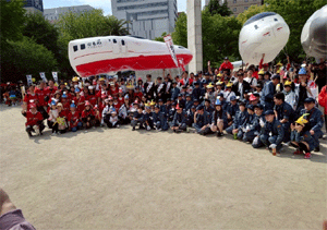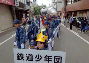 | 西九州新幹線「かもめ」などのアドバルーンを従えて 元気なJR九州と鉄道少年団をPRする九州4団の団員達 |
