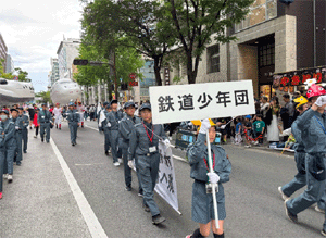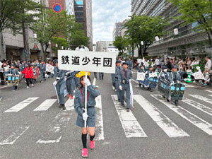 沿道のお客様に元気で旗を振りながら鉄道少年団を PRする九州4団の団員達 |