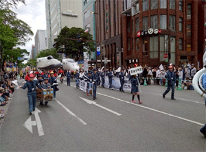 JR九州博多シティパレード隊の大きなメイン横断幕を持って 約1.3qをパレードする九州4団のの団員達 |