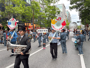 | 鉄道少年団のプラカードを先頭に、鉄道少年団の存在を しっかりとPRしながらもJR九州のD&S列車を PRする九州4団の団員達 |