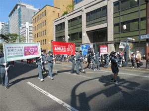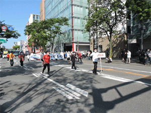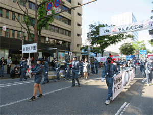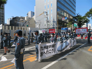 JR博多シティのプラカードや横断幕を掲げアピールする