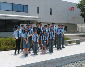 | JR九州社員研修センターのエントランスで同センターの 概要説明を受ける団員 |