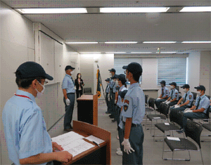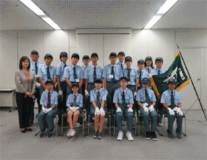 | JR九州本社会議室にて入団式に臨む団員 | JR九州広報部長から鉄道少年団の目的や 団員に期待することなどについての話に傾聴する |