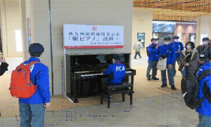 | 西九州新幹線開業記念で設置された「駅ピアノ」で 日頃の腕前を披露する団員(長崎駅) |