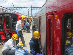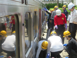 | 炎天下の中、JR九州の社員の方から手ほどきを 受けながら813系電車外板の手洗いに汗を流す団員達 |
