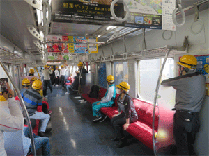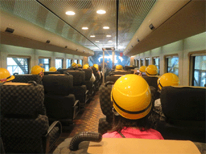 | 885系特急電車の振り子の振り子の様子を 車内で体感する団員達 |