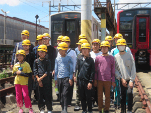 | 車両の手洗い、入換、車両洗浄装置体験を終え 記念の集合写真に収まる団員達 |
