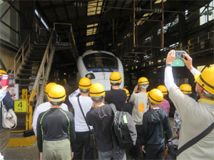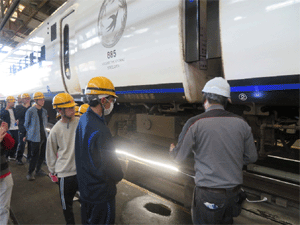 パンタグラフ検査台885系特急電車のパンタグラフの 構造などを学ぶとともに検査時の通電確認方法などに ついて説明を受ける団員達 |